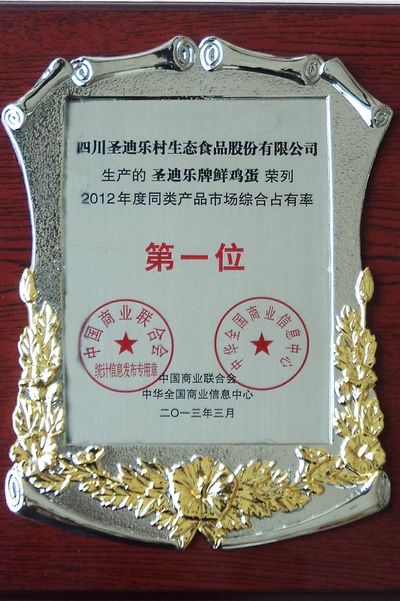 日前,在中國商業(yè)聯(lián)合會、中華商業(yè)信息中心聯(lián)合舉辦的“2012年度(第二十一屆)全國重點大型零售企業(yè)商品銷售統(tǒng)計結(jié)果新聞發(fā)布會”上,圣迪樂村雞蛋榮膺中國鮮雞蛋市場綜合占有率第一,成為全國鮮雞蛋銷量最大的冠軍企業(yè)。