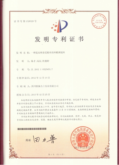 鐵騎力士集團再獲一發(fā)明專利 2014-02-18 分享到: 2月17日,由鐵騎力士集團馮光德實驗室申請的《一種提高種蛋受精率的種鵝預混料》獲得國家發(fā)明專利授權,專利號為ZL201210525453.7。 本發(fā)明是鐵騎力士馮光德實驗室在家禽技術領域的一項創(chuàng)新,該預混料富含種鵝在生長過程中所需的多種維生素與微量元素,與常規(guī)原料搭配使用不僅滿足了種鵝的基礎營養(yǎng)需要,特別增添的維生素和微量元素極大地提高公鵝的精液質量,保證種蛋的受精率,為養(yǎng)殖增加了效益。 上一篇 返回列表 下一篇