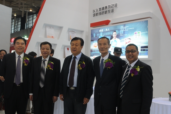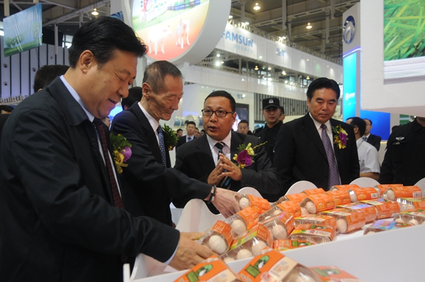 24日上午,集團執行總裁李全出席了展會開幕式。隨后,農業部副部長于康震、中國飼料工業協會會長高鴻賓、全國畜牧總站站長、中國飼料工業協會秘書長李希榮、農業部畜牧業司司長王智才等行業領導專程來到鐵騎力士展館參觀。李全向高鴻賓會長一行詳細介紹了鐵騎力士打造全產業鏈,為大家提供優質、安全、健康的產品的具體做法,高會長一行還饒有興致地拿起圣迪樂村雞蛋仔細端詳,當看到公司“科技 為人”的標語時,還仔細詢問了集團最新的發展情況,并給予了高度贊揚。